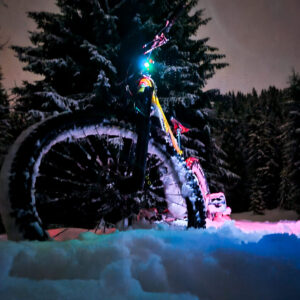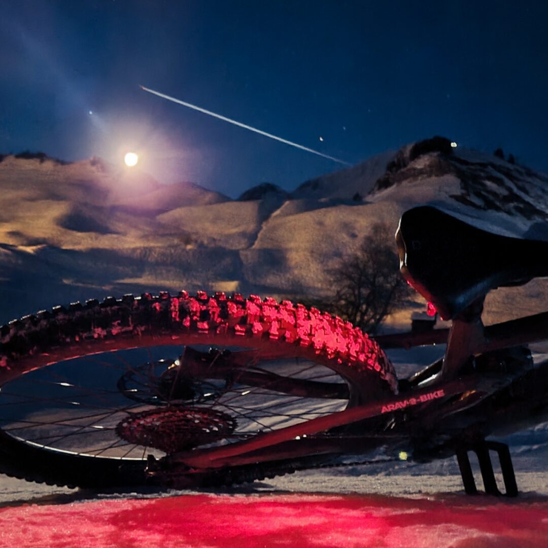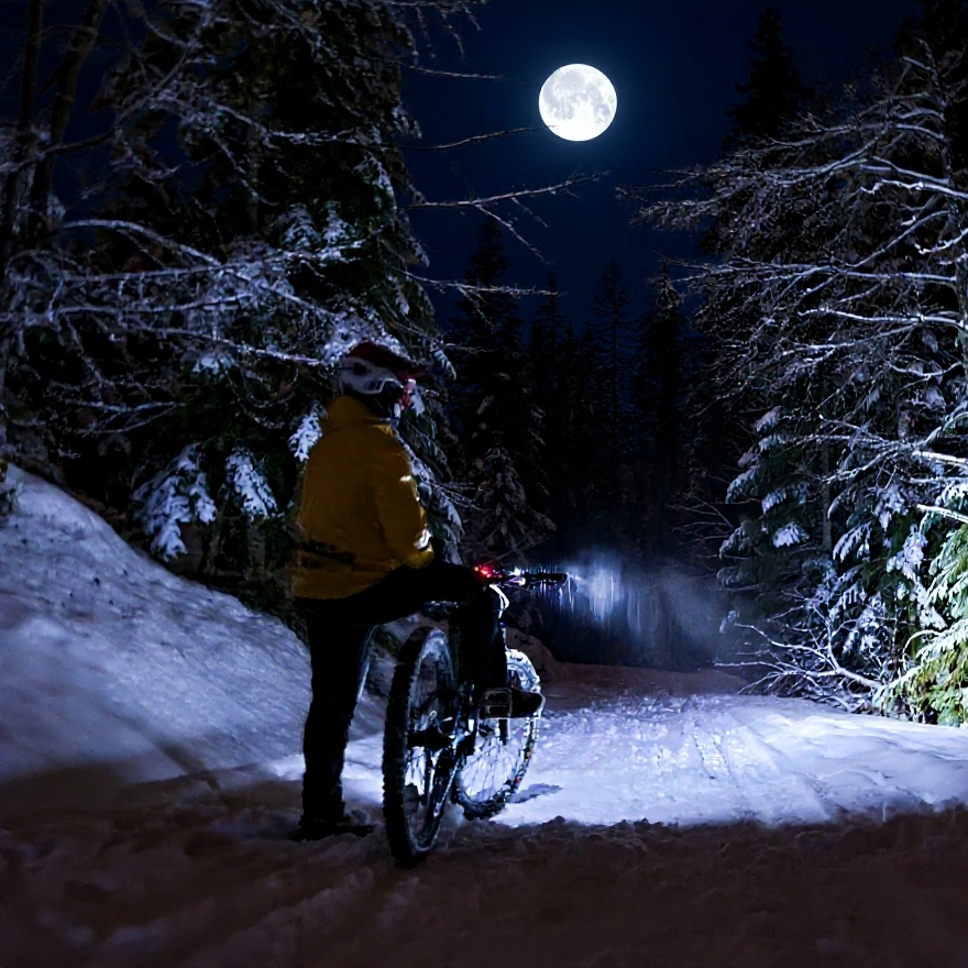 - Montée sur piste de fatbike damée, illuminée par la pleine lune