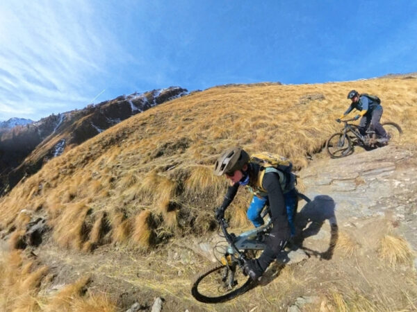 Une fois au sommet de l’Almet, direction le col des Annes. Le coucher de soleil fait déjà des siennes. Nous basculons derrière les petites fermes du col. Les panneaux d’indications manquent à l’appel, mais en suivant le tracé nous retrouvons notre chemin. Nous laissons la Pointe Percée sur notre droite et longeons les Aravis au fur et à mesure que le soleil décline, c’est juste à tomber ! La Pointe de Bella Cha prend des teintes rosées. Au détour d’un sentier, des Abondances broutent tranquillement. Nous descendons de vélo pour les dépasser. La nuit commence à tomber, il ne faudrait pas les effrayer.